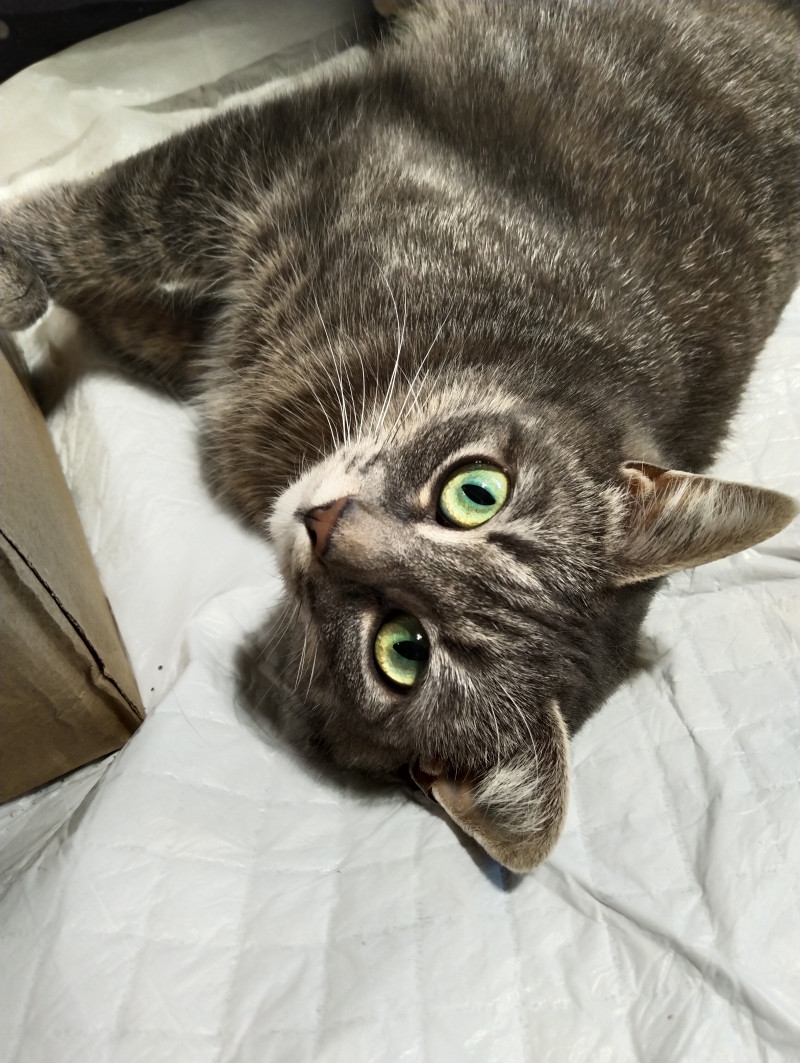 Она за полтора месяца разожралась до квадратного формата и оборзела. Отвоевала все 4 лотка. Нагло заваливается к бабкам и тиранит их доставучестью.
