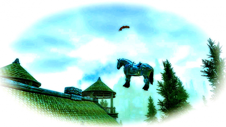 Ага — так это же лошадиный навоз! Герой Скайрима задрал вверх голову. Над крышей поместья в воздухе парил жеребец Мороз. Ну, от этого коня всего ожидать можно; видать, обеспечивал защиту поместья с воздуха…