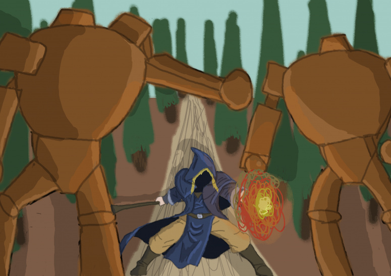 Впереди на лесной тропе возвышалась огромная повозка, размером с небольшой дом и сделанная с очевидным мастерством. Её тёмное дерево сияло защитными чарами, а десятки металлических укреплений говорили о её немалой ценности. Не менее любопытны были и те, кто тянул повозку: големы, причём массивные, каждый ростом выше трёх метров.