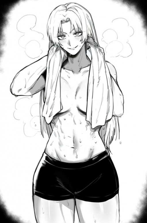 Дверь распахивается через мгновение: на пороге сама виновница — только что из душа, вытирается полотенцем. На ней шортики и... больше ничего.