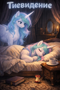 Там, в гнезде из атласных простыней и пуховых подушек, покоилась она. Спящая Селестия. Грива, обычно переливающаяся всеми оттенками, перламутра, зелени и лазури, сейчас тускло мерцала во сне, будто подёрнутая лёгкой дымкой. Ноздри мерно раздувались. Ресницы безмятежно подрагивали.