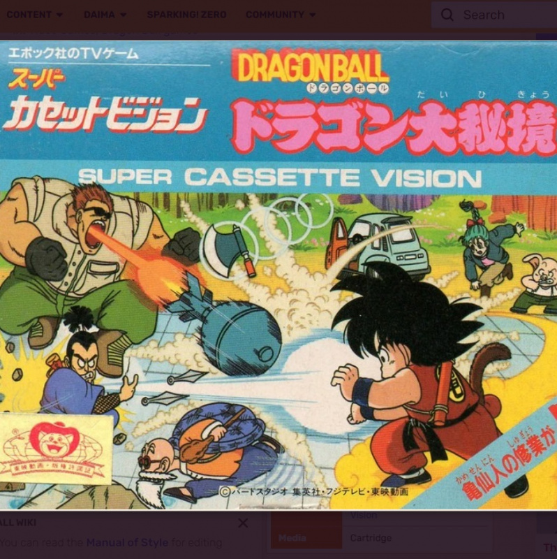 Страна: Япония Разработчик: TOSE Software Co. Издатель: Bandai Платформа: Nintendo Famicom Действие игры происходит с участием Гоку и очень приблизительно повторяет первые два тома манги "Dragon Ball". Игра состоит из 2D-областей, где Гоку должен сражаться с множеством врагов, и последовательностей с боковой прокруткой для сражений с боссами.