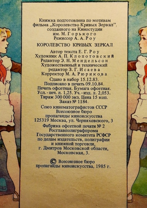 Страна: СССР Автор: Виталий Губарев Книга-комикс объёмом 20 страниц по мотивам фильма «Королевство кривых зеркал», снятого на киностудии им. М. Горького, режиссёр А.Роу по сценарию В. Губарева и Льва Аркадьева.