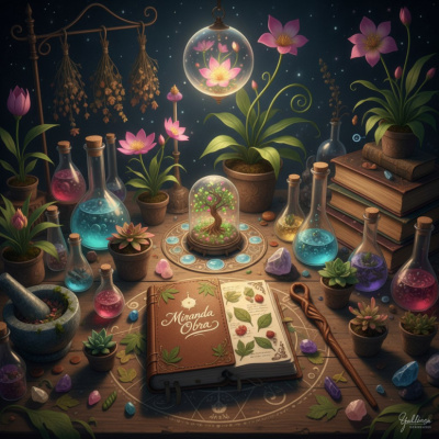 Растения подвешены в колбах, колбы с разноцветными зельями на столе, шикарное зелёное кресло и объемный дневник в виде старинной книги